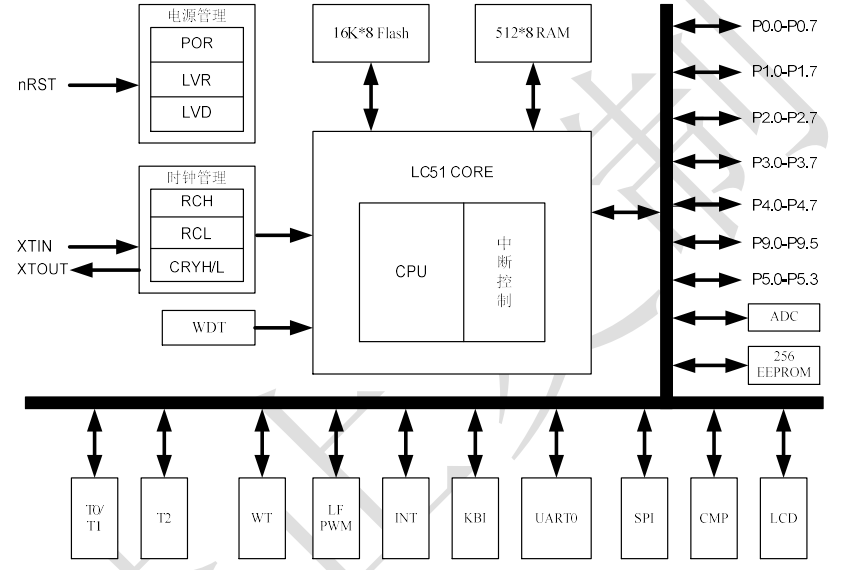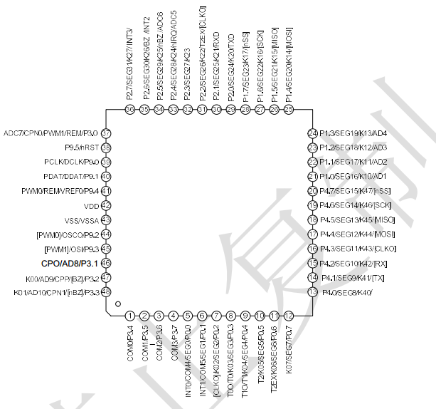 ² 內置電阻型 LCD 驅動器,電阻型 LCD 對比度 8 級可調,3 種驅動能力可選,具有快速充電模式;最大支持 4X35 段,5X34 段,6X33 段;1/2、1/3 偏置可選。